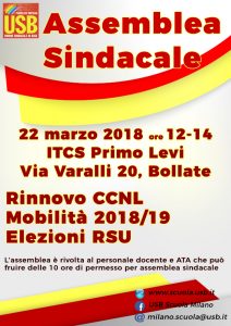 Si avvisa che l’organizzazione sindacale USB Scuola ha indetto per giovedì 22 marzo 2018 dalle ore 12.00 alle ore 14.00 (più un’ora per gli spostamenti) una ASSEMBLEA SINDACALE per il personale docente e ATA in servizio presso le scuole di Milano Città Metropolitana, presso l’ITCS Primo Levi, Via Varalli 20, Bollate, al fine di discutere dei seguenti argomenti: