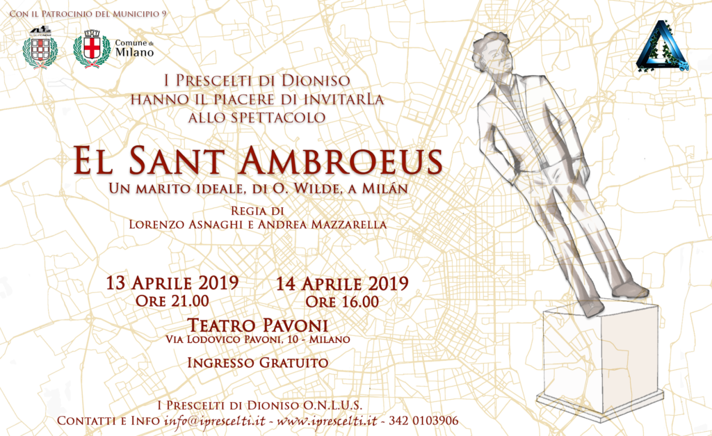 Si comunica che le studentesse e gli studenti del Laboratorio Teatrale I Prescelti di Dioniso metteranno in scena lo spettacolo El Sant Ambroeus, Un Marito Ideale, di O. Wilde, realizzato con il Patrocinio del Municipio 9.